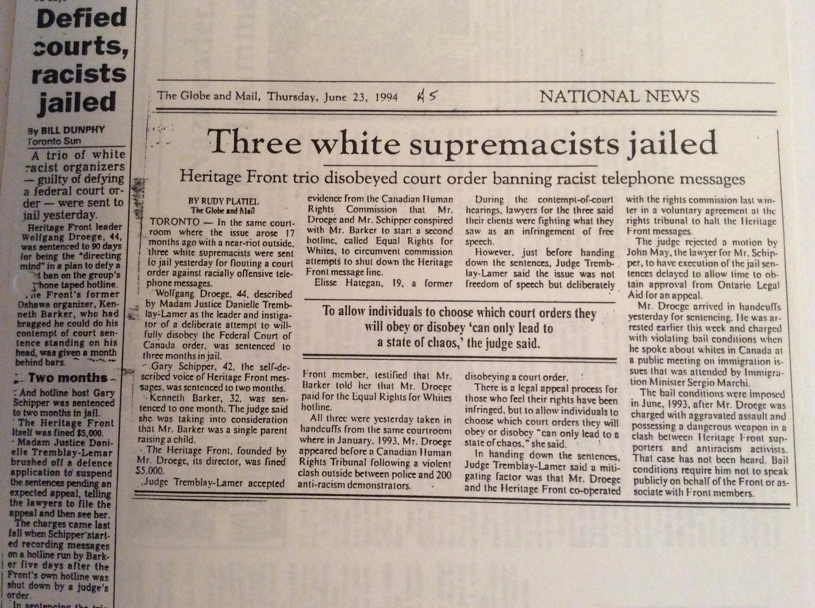 "Heritage Front Members Found Guilty of Contempt." Kitchener-Waterloo Record, June 3, 1994.