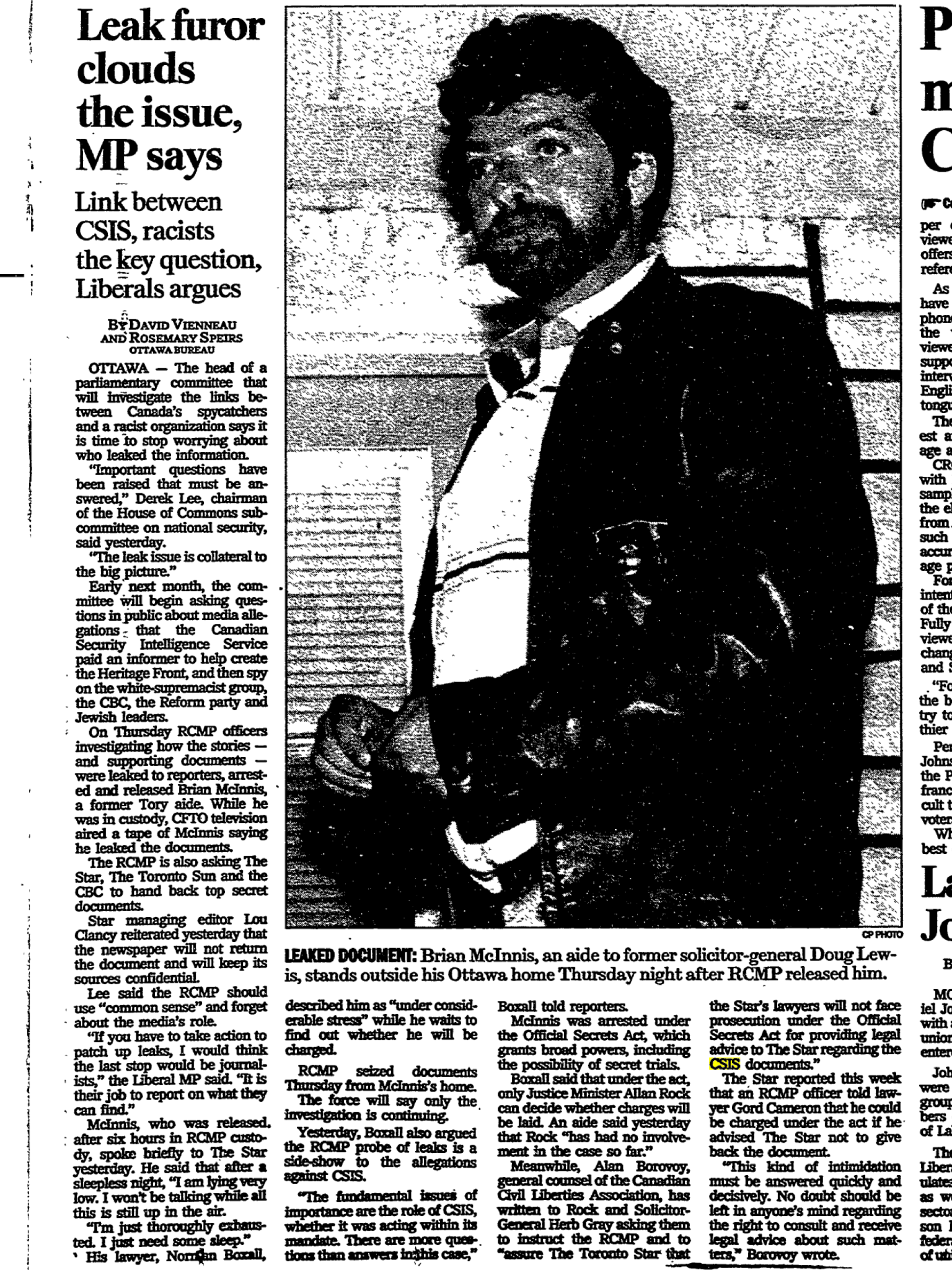 Vienneau, David and Speirs, Rosemary. "Leak Furor Clouds the Issue, MP Says: Link Between CSIS, Racists the Key Question." Toronto Star, August 27, 1994.