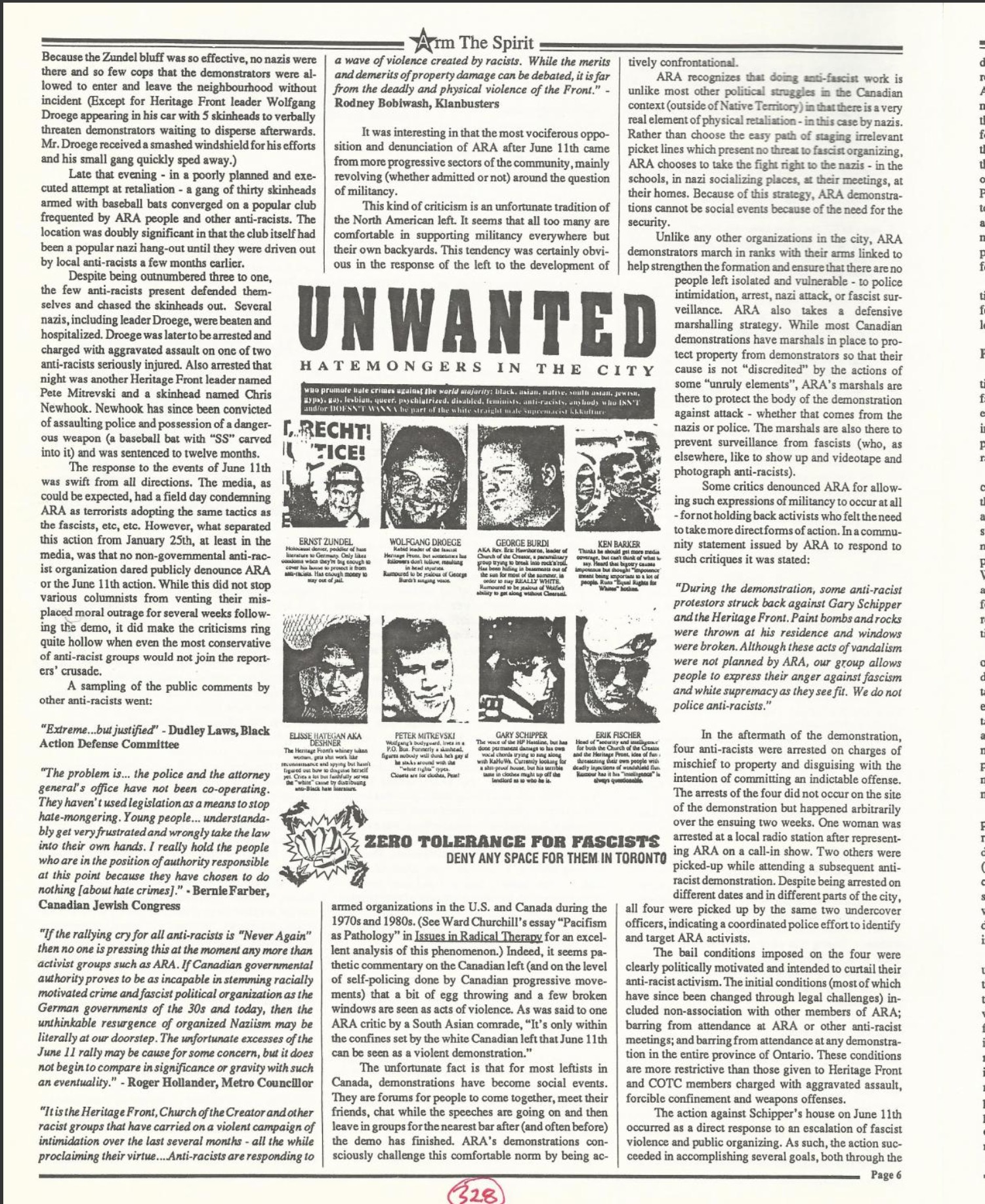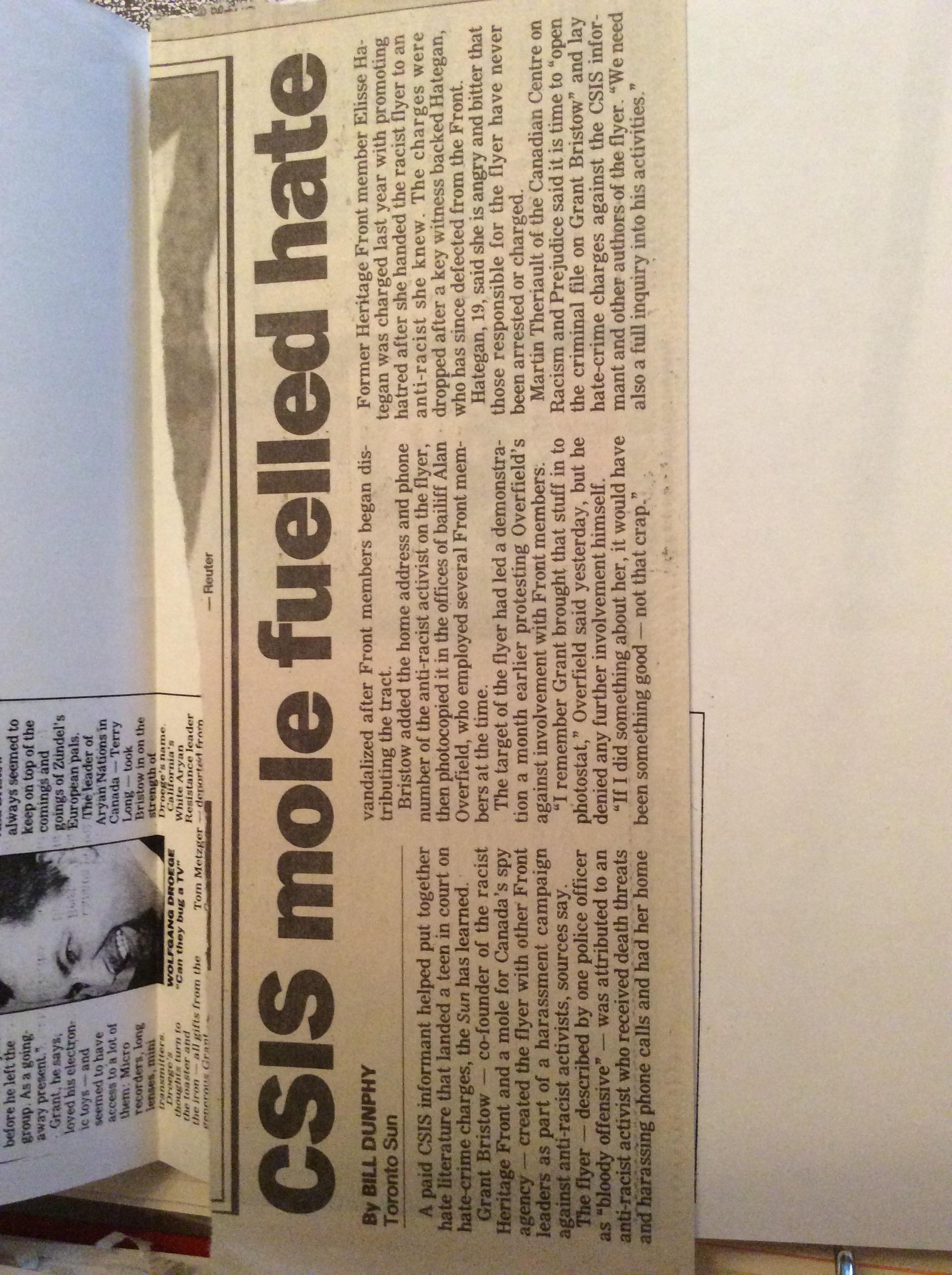 Dunphy, Bill. " STIR IT UP. Spy Unmasked: CSIS Informant ‘Founding Father’ of White Racist Group," Toronto Sun, 14 Aug. 1994.
