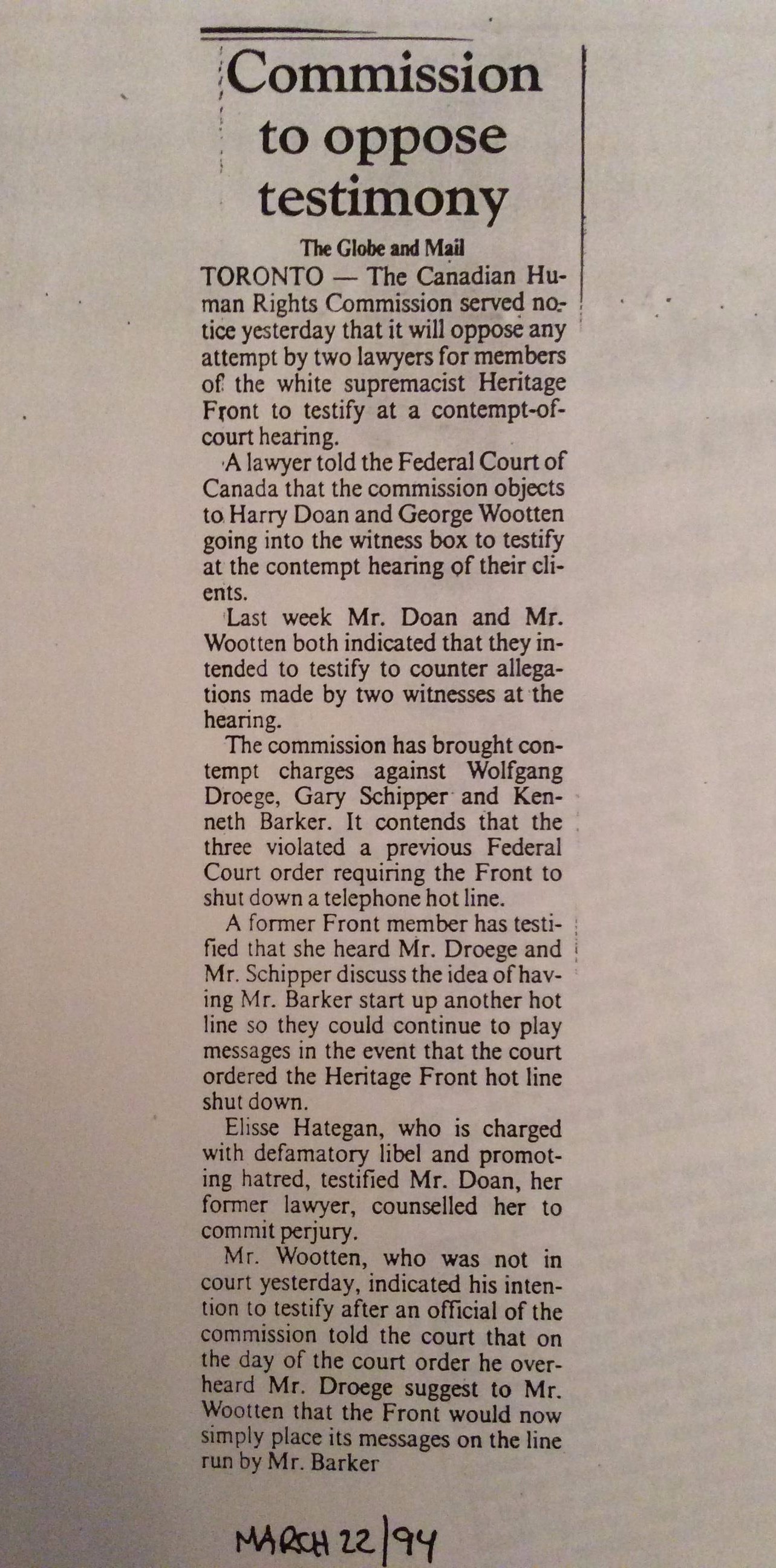 Platiel, Rudy. "Commission to Oppose Testimony." Globe and Mail, March 22, 1994.