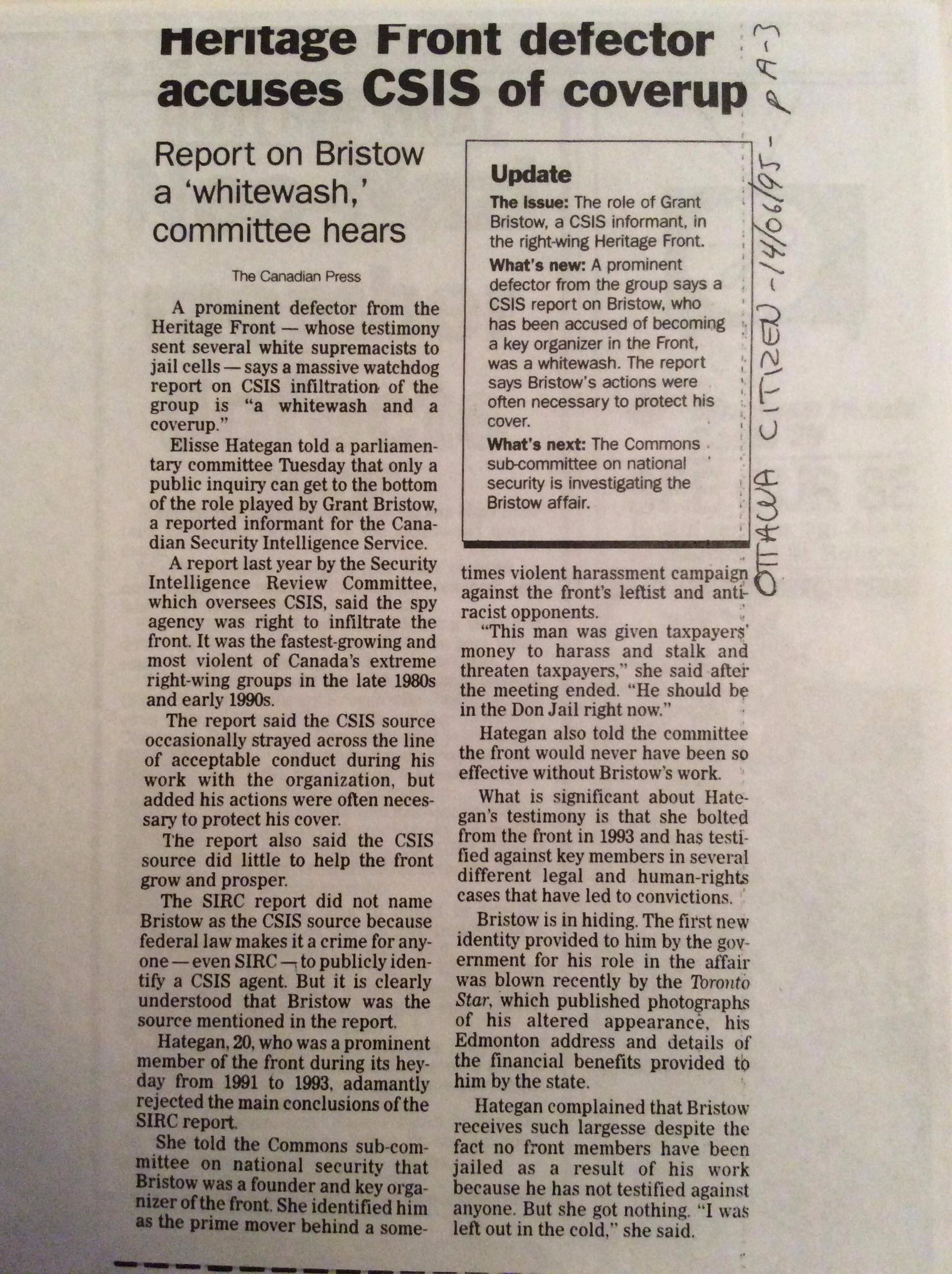 The Canadian press. "Heritage Front Defector Accuses CSIS of Coverup." Ottawa Citizen, June 14, 1995.