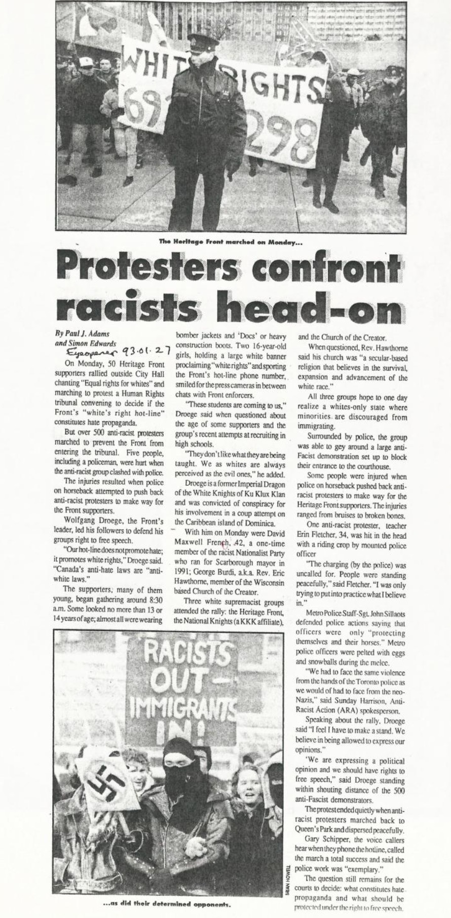 Small, Peter. "Charges Laid after Leaflets Called Racist Distributed." Toronto Star, February 1993.