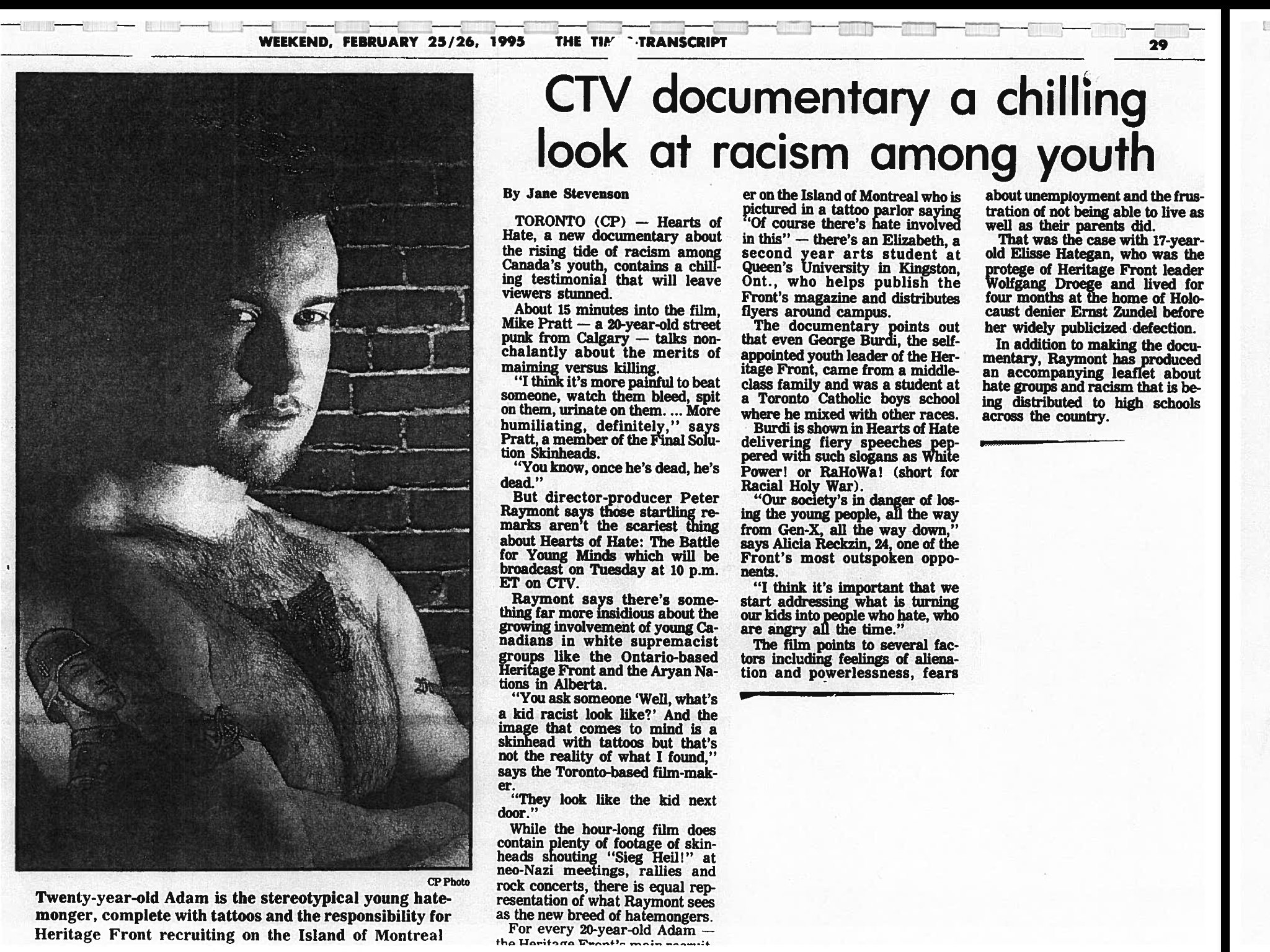 Stevenson, Jane. "CTV Documentary a Chilling Look at Racism Among Youth." Canadian Press, February 25/26, 1995.