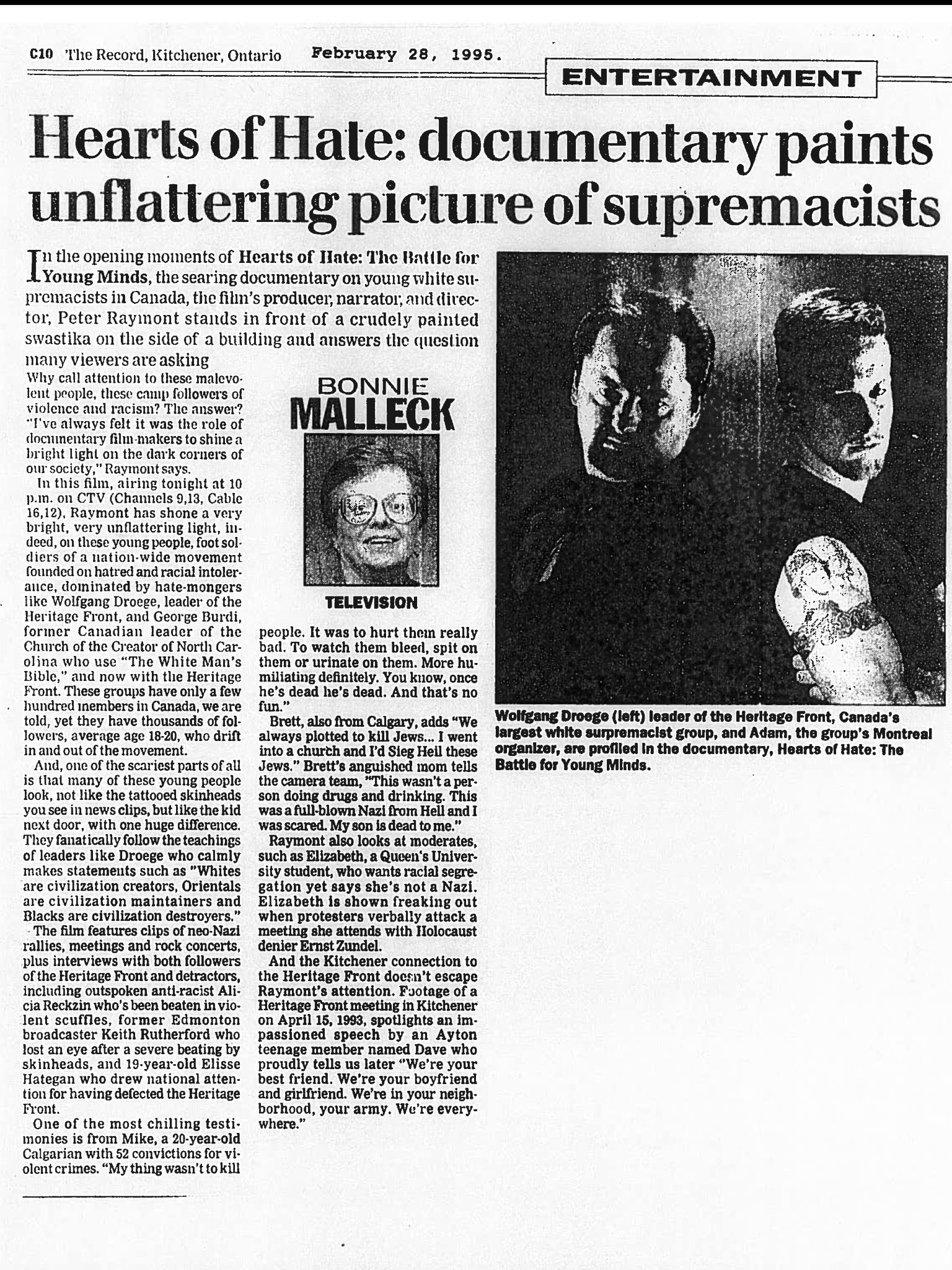 Malleck, Bonnie. "Hearts of Hate: Documentary Paints Unflattering Picture of Supremacists." Kitchener-Waterloo Record, February 28, 1995.