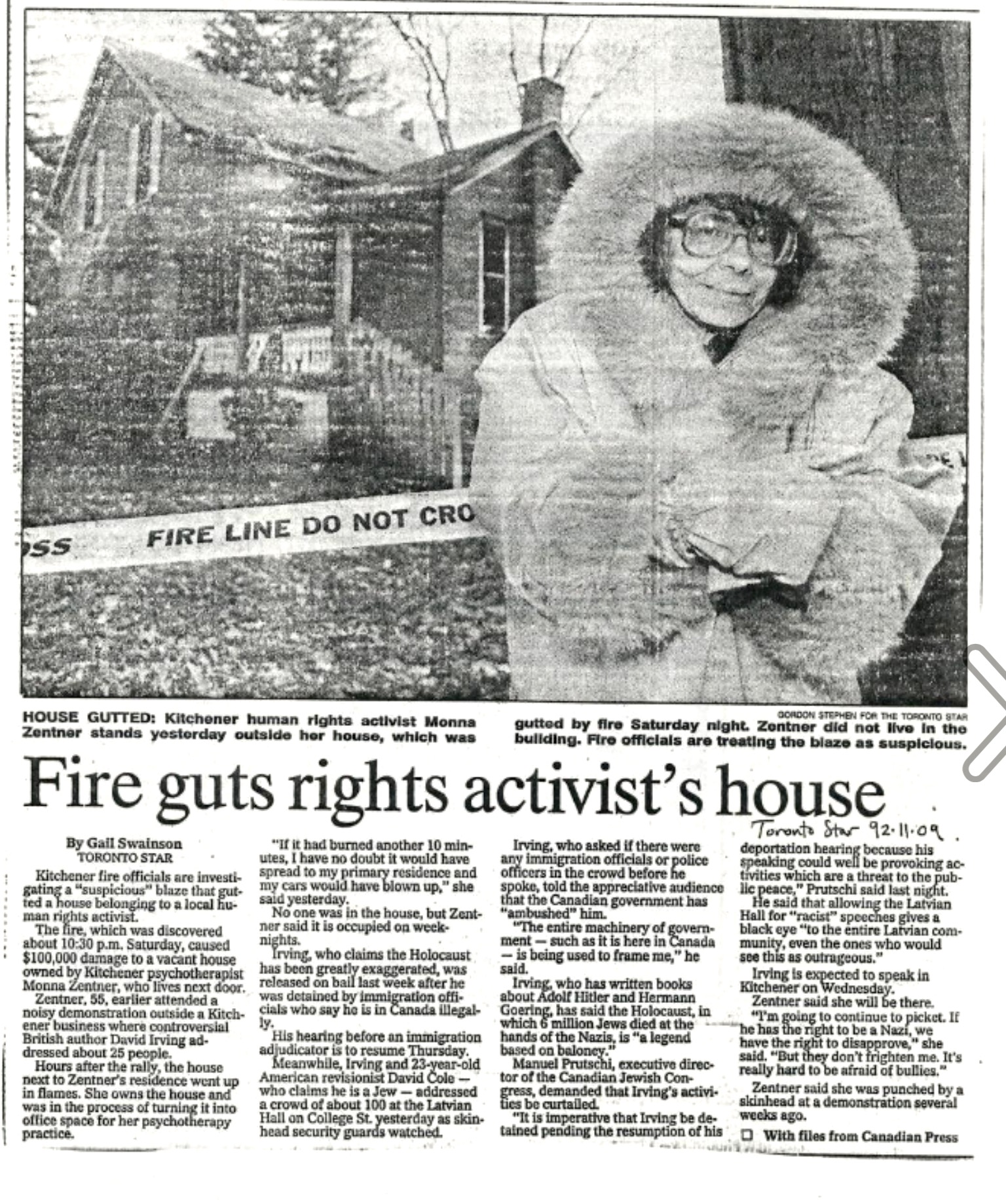 Swanson, Gail. "Fire guts rights activist's house". Toronto Star, 1992-11-09.