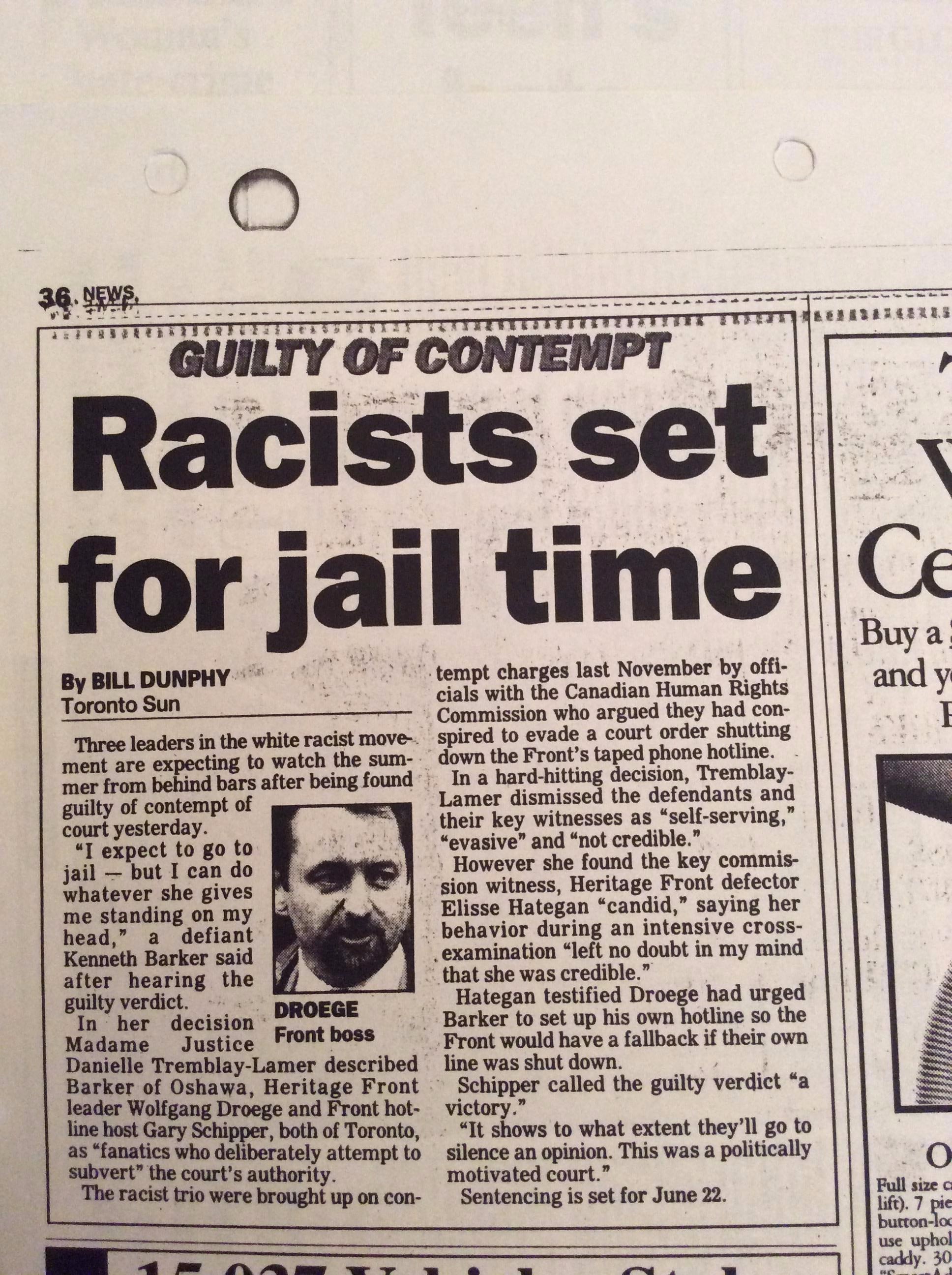 Dunphy, Bill. "Guilty of Contempt: Racists Set for Jail Time." Toronto Sun, 1994.