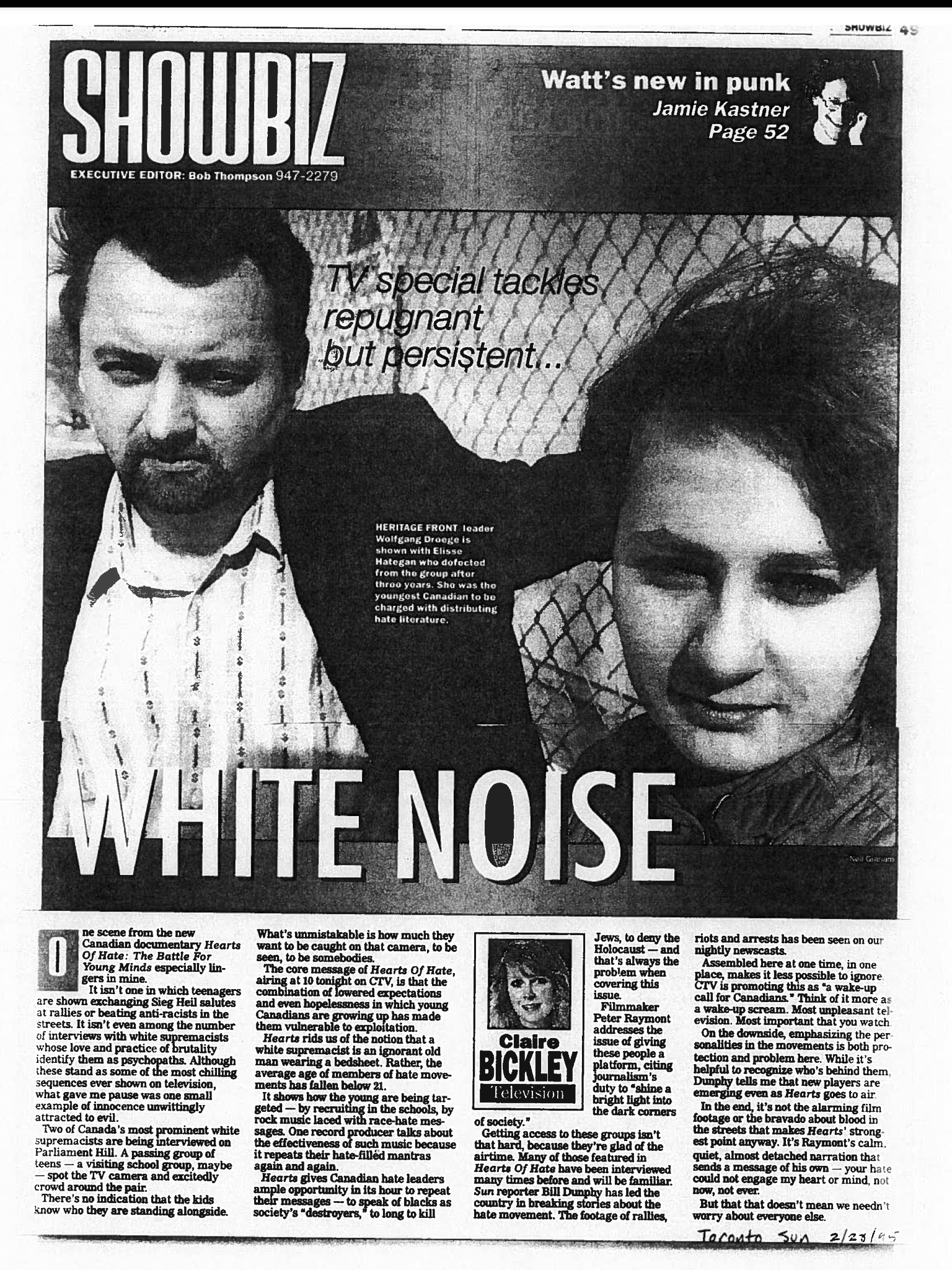 Bickley, Claire. "TV Special Tackles Repugnant but Persistent White Noise." Showbiz Week, Toronto Sun, February 28, 1995.