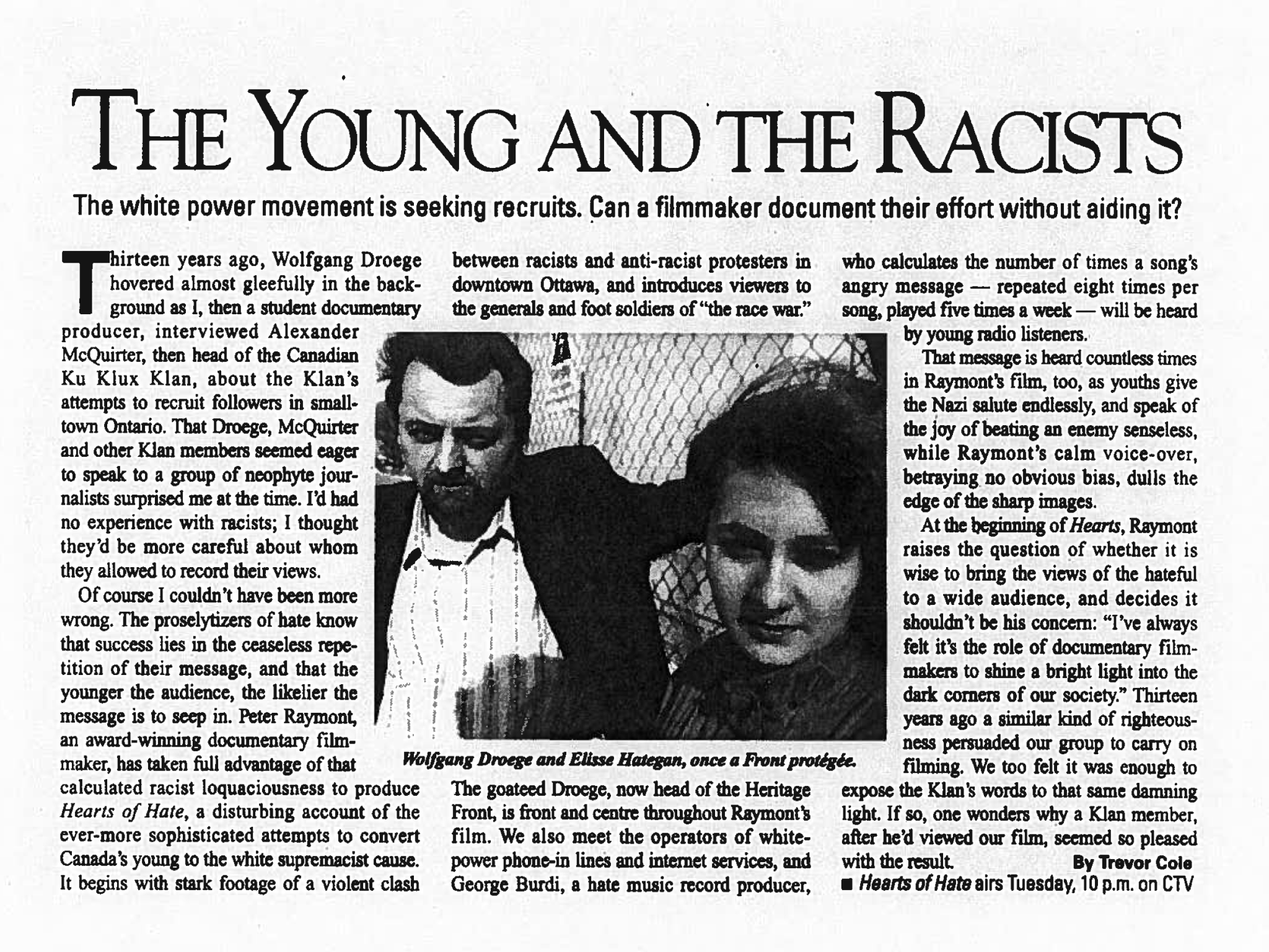 Cole, Trevor. "The Young and the Racists." Globe and Mail, Broadcast Week Magazine, February 25 - March 3, 1995.