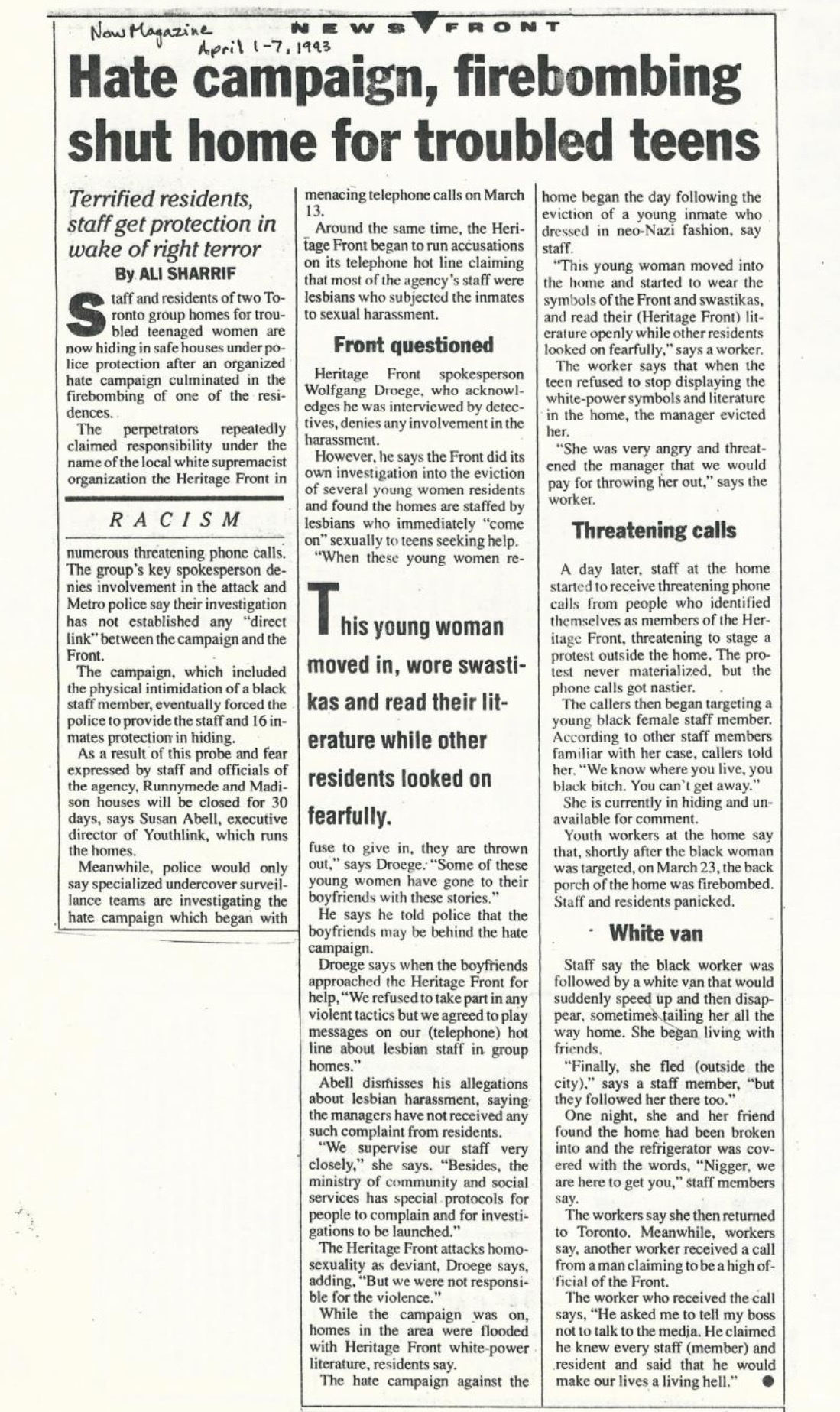 Sharrif, Ali. "Hate Campaign, Firebombing Shut Home for Troubled Teens." Now Magazine, April 1-7, 1993. About Youthlink House terrorism/ bombing
