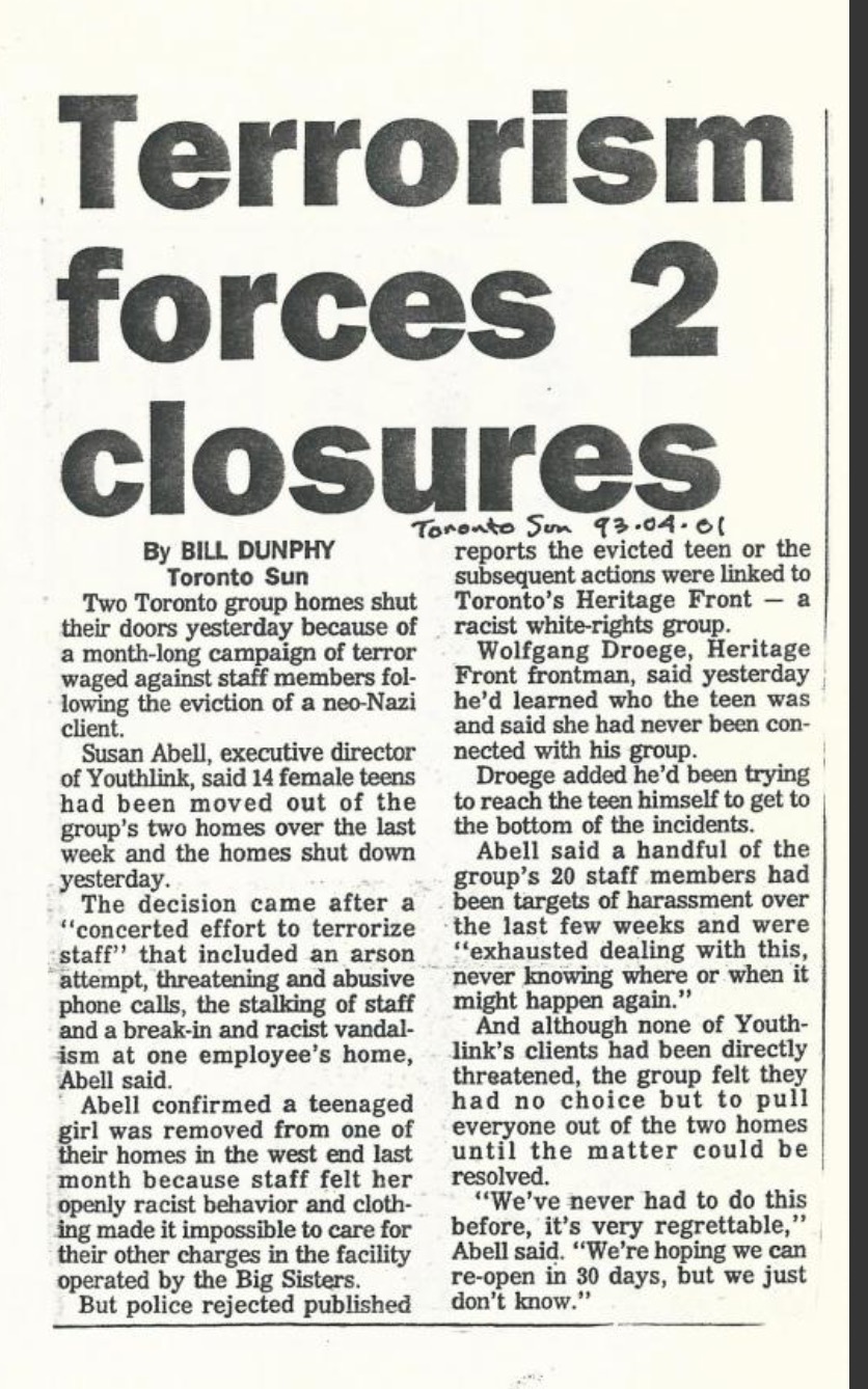This collection of press links, footage and clippings is being compiled in order to create an accurate historical archive that preserves the events of the 1990s, as well as sets the record straight about crimes within the Heritage Front.